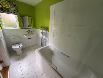 En-suite comprising bath with shower over, wc, wash hand basin and tiled floor.
