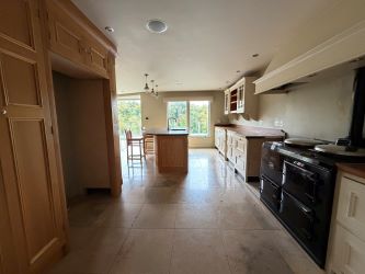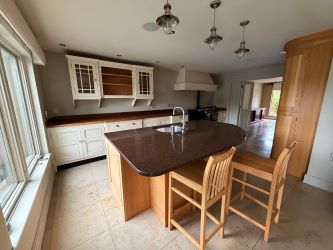 With fully fitted extensive range of eye and low level units, centre island with storage and stainless steel sink unit, glass display cabinet, display shelving, feature surround fireplace, tiled floor and door leading to balcony.Measurements to widest points.