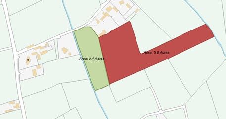 These agricultural lands extend to approximately 8.2 acres in total and are laid entirely in grass. The holding is divided into two well-defined fields, with Field 1 measuring approximately 2.4 acres and Field 2 extending to approximately 5.8 acres, making it suitable for a range of livestock or grazing uses.